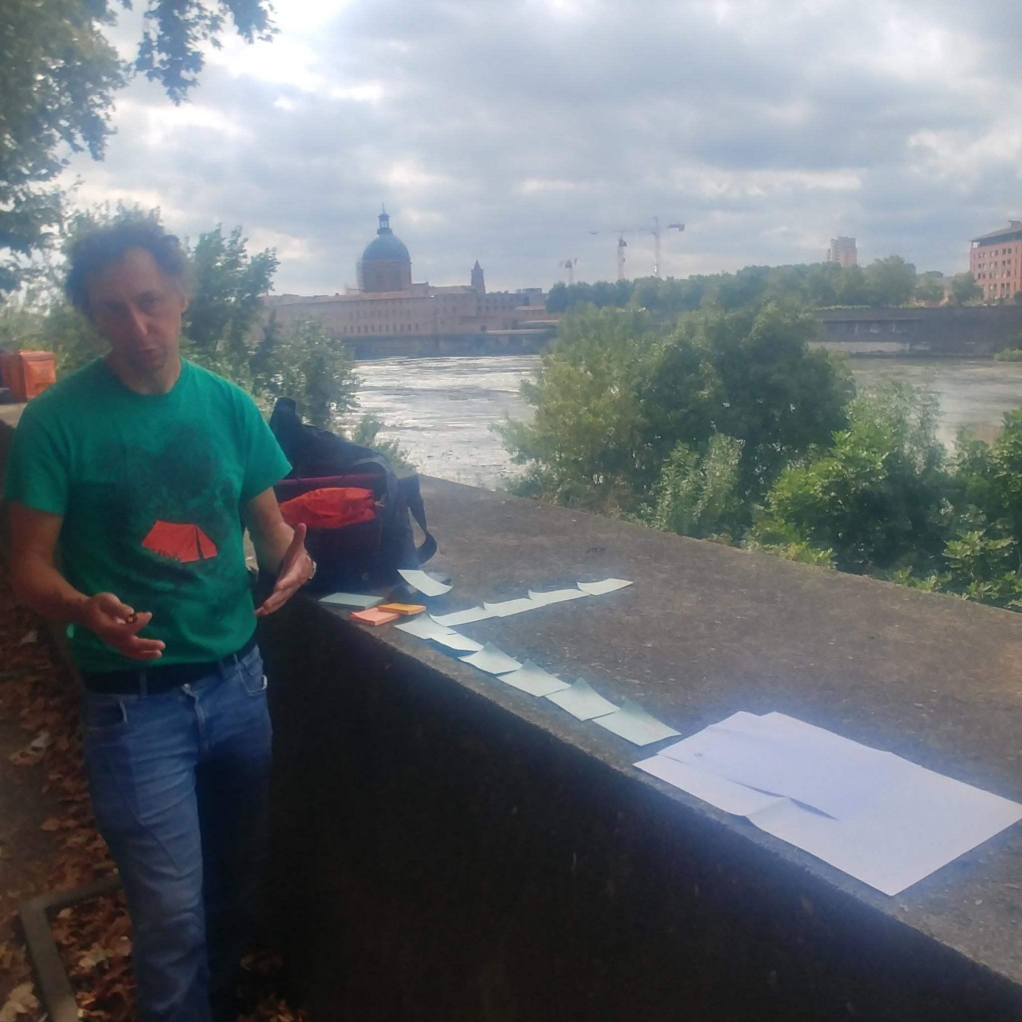 Sur la digue de la Garonne, nous avons déroulé l’atelier OVNI animé par Anthony. Improvisé avec des post-it et un stylo. Les post-it posés sur le muret de la digue.